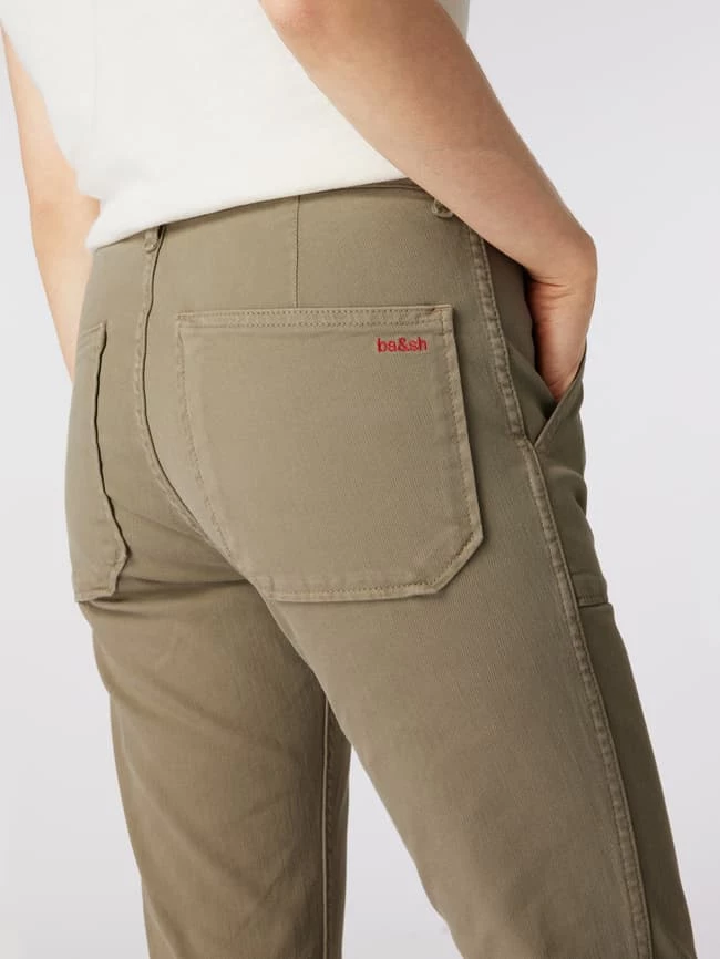 Die Hose von ba&sh ist aus einem Baumwoll-Mix mit Stretch-Anteil gefertigt und im Tapered Fit gehalten. Sie zeigt sich im unifarbenen Design mit seitlichen Eingrifftaschen.